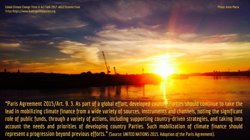 Paris Agreement 2015/Art. 9. 3 “As part of a global effort, developed country Parties should continue to take the lead in mobilizing climate finance from a wide variety of sources, instruments and channels, noting the significant role of public funds, through a variety of actions, including supporting country-driven strategies, and taking into account the needs and priorities of developing country Parties. Such mobilization of climate finance should represent a progression beyond previous efforts.” (United Nations 2015. Adoption of the Paris Agreement).