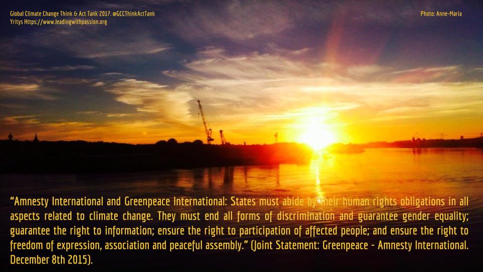 “Amnesty International and Greenpeace International: States must abide by their human rights obligations in all aspects related to climate change. They must end all forms of discrimination and guarantee gender equality; guarantee the right to information; ensure the right to participation of affected people; and ensure the right to freedom of expression, association and peaceful assembly.” (Joint Statement: Greenpeace – Amnesty International. December 8th 2015).