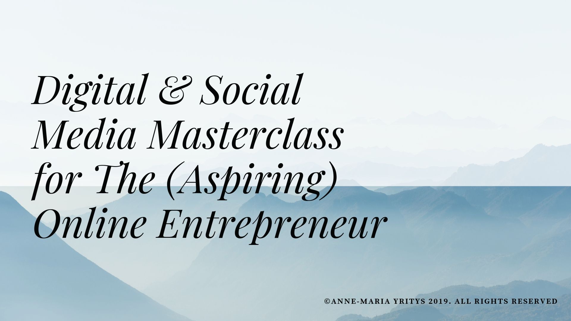 Course Material Payment: Digital & Social Media Masterclass for The Aspiring Online Entrepreneur. Please remember to send me your contact information with the payment: Name and e-mail address so I can send you the course material after your purchase. Thank you. Sincerely, Anne-Maria Yritys